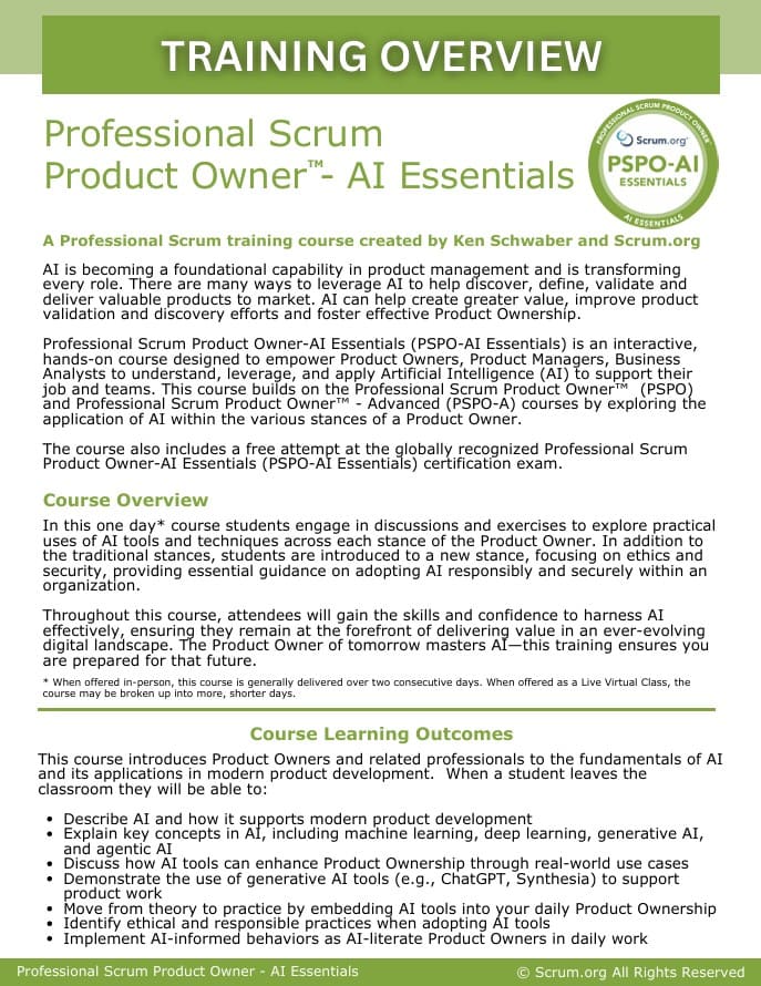 - Incluye 2 intentos del examen PSPO – IA de Scrum.org.